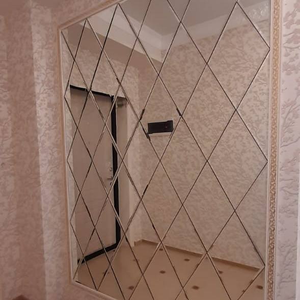 Для украшения использовалась зеркальная плитка формы вытянутый ромб серебряного цвета.
